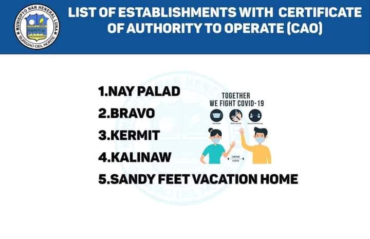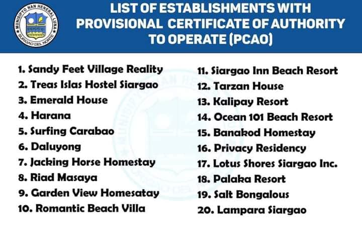 Initially, there are five (5) business establishments within the municipality of General Luna that have been issued with Certificate of Authority to Operate (CAO) and forty-five (45) with Provisional Certificate of Authority to Operate (PCAO) by the Department of Tourism - Caraga Region.