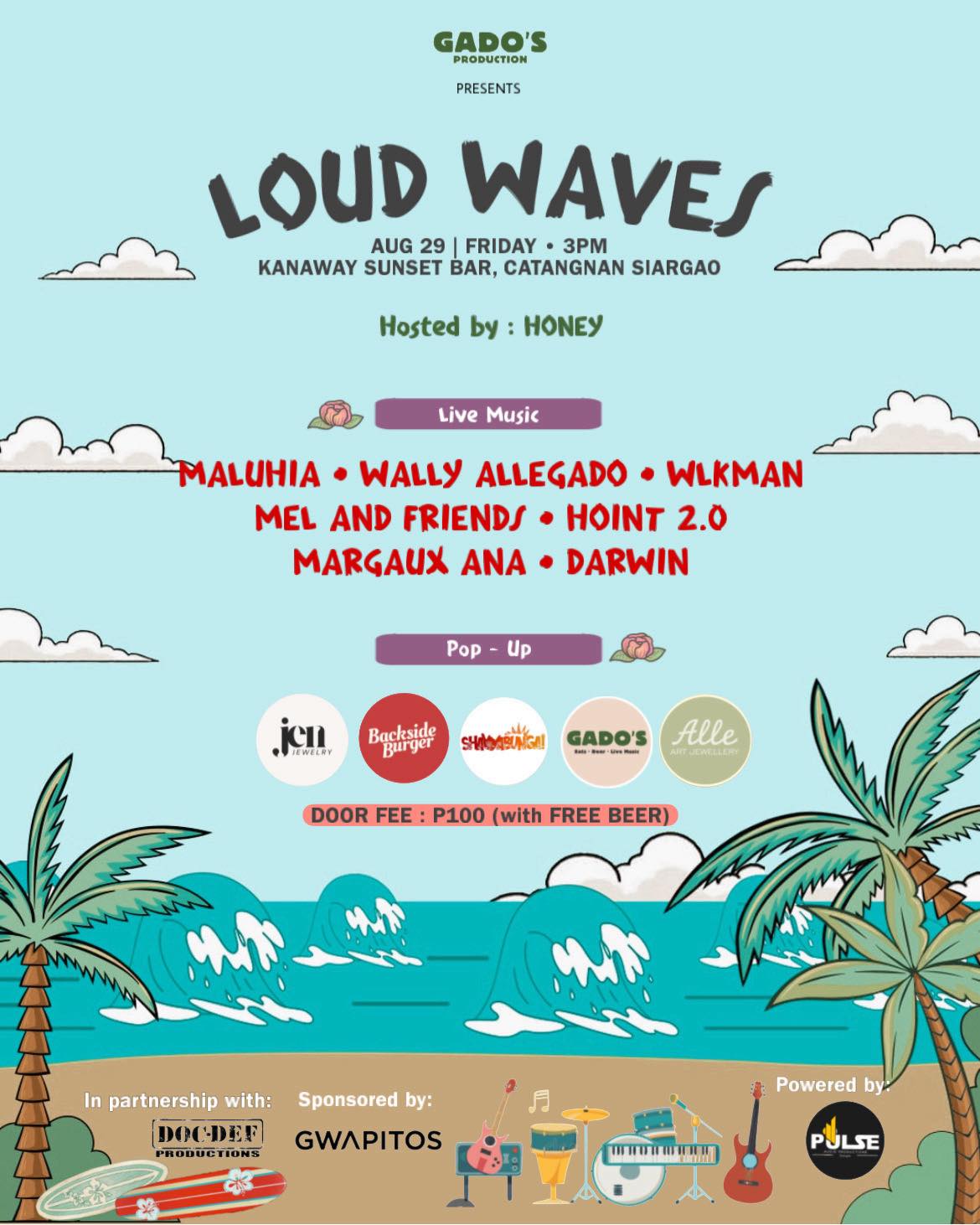 Our 2nd installment for LOUD WAVES music, crafts and food festival is happening this coming friday (Aug 29 at 3pm) at KANAWAY SUNSET BAR, Catangnan Siargao. Vibe with the best live music from island grooves, blues and rock with performers from Hawaii, Davao, Cagayan De Oro, Bukidnon and Siargao.