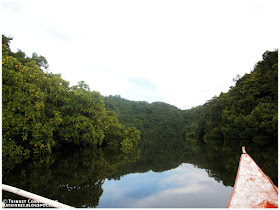We started out early the next morning, taking off from the dock behind the Mangrove Information Center on a small motorized outrigger. Our guide and boatman was the local Katala Forest Ranger Noel. He expertly manuevered us through the maze of mangroves until the low hills of Poneas island greeted us. The greenery was a refreshing site, forested hills rose above the mangroves, the water flat and reflecting the grey skies. As we entered a hidden lagoon, a pair of Mindanao Hornbills flew across our boat's path.