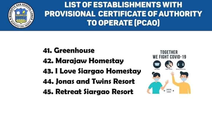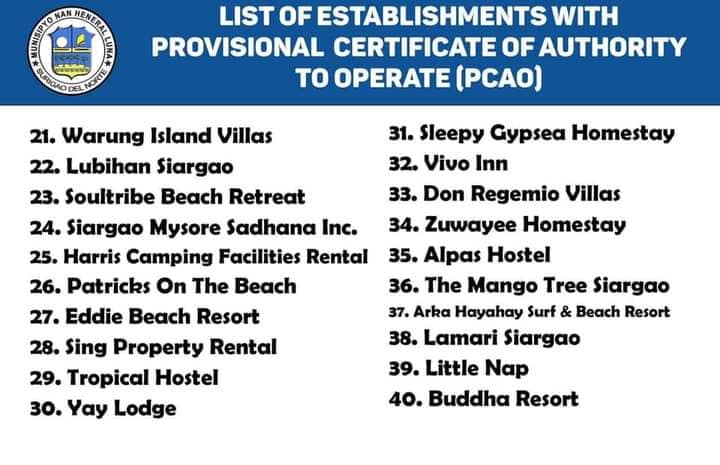 Initially, there are five (5) business establishments within the municipality of General Luna that have been issued with Certificate of Authority to Operate (CAO) and forty-five (45) with Provisional Certificate of Authority to Operate (PCAO) by the Department of Tourism - Caraga Region.